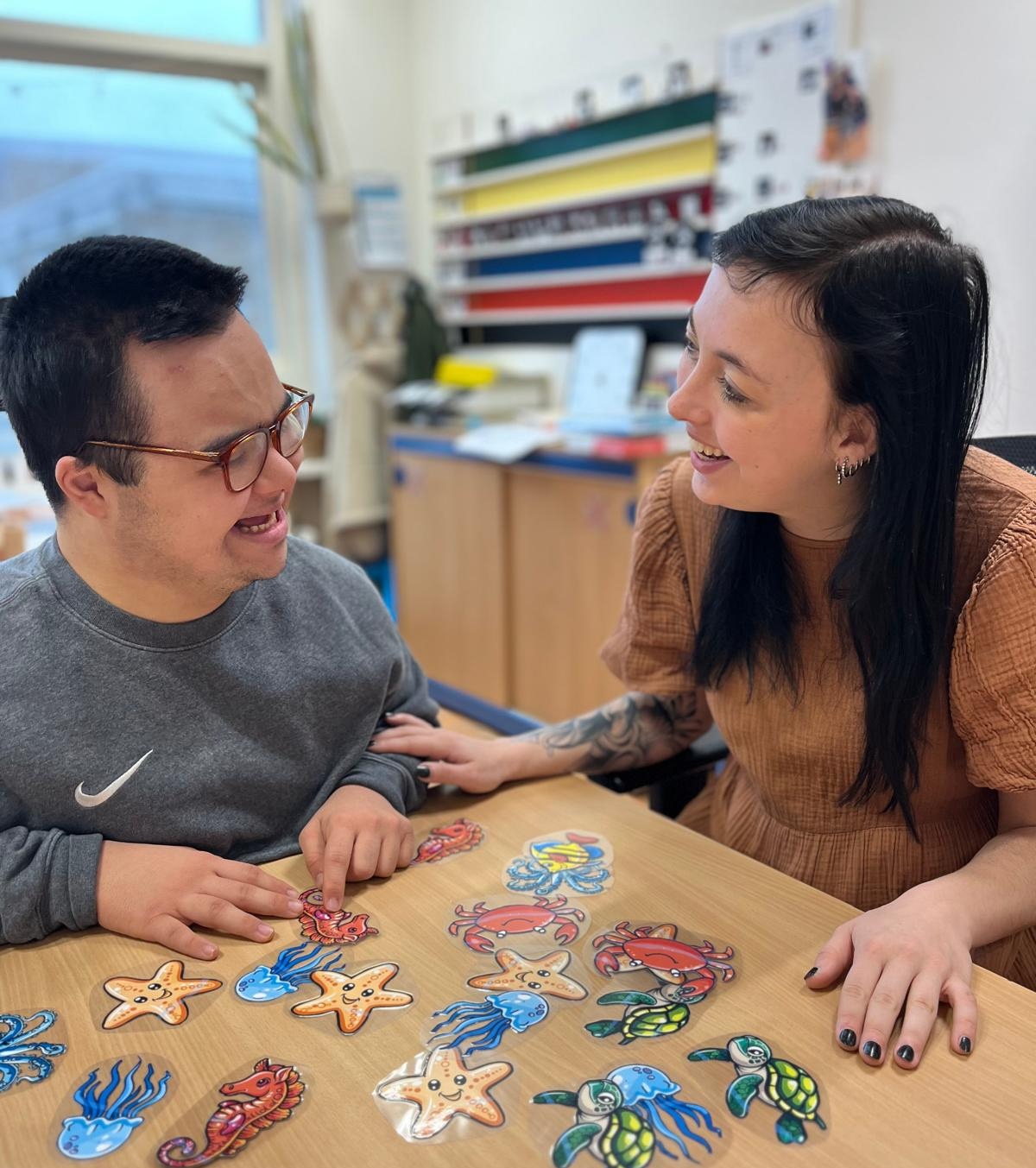 Ik heb jongeren van ongeveer twaalf tot en met achttien jaar in de klas. De middelbare school van het speciaal onderwijs dus. De plusgroep is misschien een beetje een bijzondere benaming, want ik heb jongeren in de groep die in het reguliere speciale onderwijs lastiger meekomen en meer ondersteuning nodig hebben. De leerlingen hebben een verstandelijke beperking en leren op het niveau van baby tot ongeveer groep 3-niveau. Eigenlijk zijn het hele jonge kinderen, maar wel al vaak in een groot puberlijf. Met snor en baard enzo.